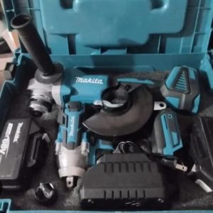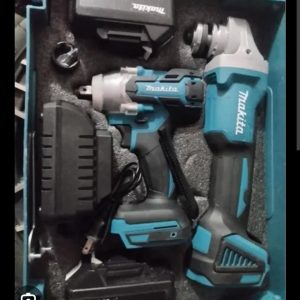 La imagen muestra un kit de herramientas eléctricas inalámbricas, que incluye un taladro de impacto y una amoladora angular, junto con baterías, un cargador y otros accesorios, todo dentro de un estuche. El kit es de la marca Makita, aunque algunas piezas tienen la marca “Mukins”.